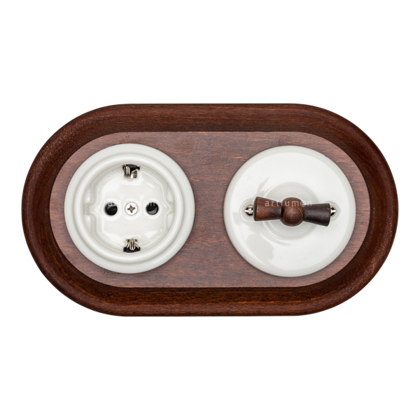 Conjunto formado por interruptor conmutado y base de enchufe fabricados en porcelana blanca y marco doble de madera oscura. El interruptor tiene el lazo (maneta) de madera natural de haya con barniz color castaño oscuro. Para instalación empotrada. Mecanismos clásicos de porcelana sobre madera de haya con barniz color castaño oscuro. Cuidados diseños que nos trasladan a ambientes rústicos. De formas planas y suaves para que los mecanismos de porcelana no sobresalgan en exceso de la pared.