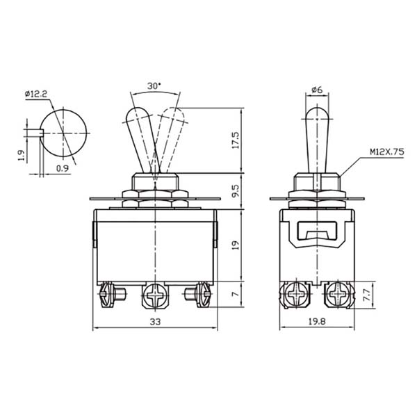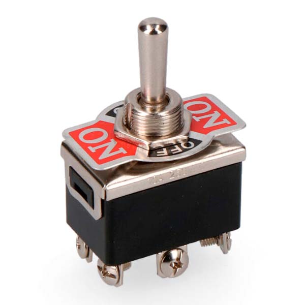 Interruptor bipolar de 6 patillas, con 2 encendidos y un paro central (ON/OFF/ON). Tipo palanca, conocidos como “interruptores de rabillo”.