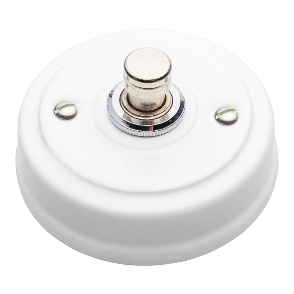 Interruptor con mecanismo conmutado accionado por un botón metálico. La luz se enciende pulsando el botón. Combina a la perfección con nuestros enchufes de porcelana de esta misma serie.