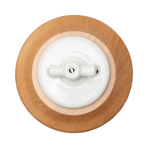 Interruptor conmutado fabricado en porcelana blanca con marco de madera clara para instalación empotrada. Mecanismos clásicos de porcelana sobre madera de haya con barniz acabado natural. Su estilo fresco se integra a la perfección en decoraciones de ambiente mediterráneo.