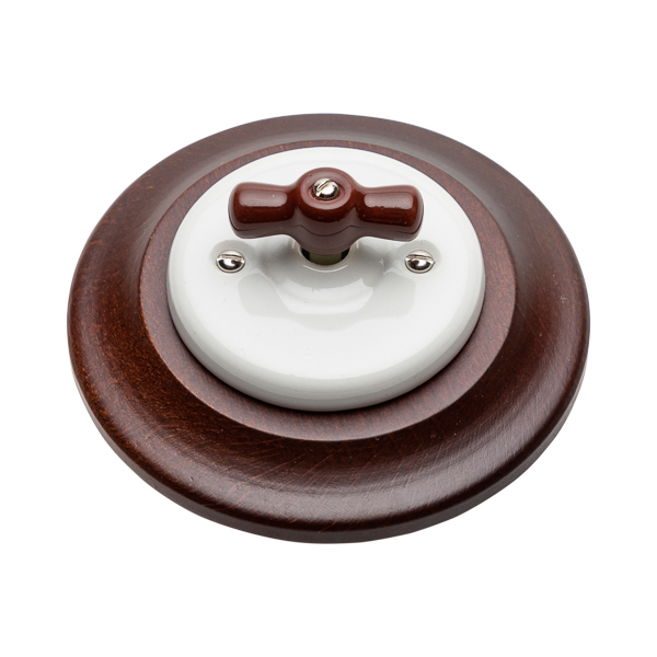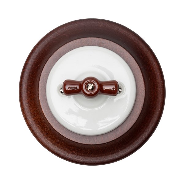 Interruptor conmutado fabricado en porcelana blanca con marco de madera oscura para instalación empotrada. Mecanismos clásicos de porcelana sobre madera de haya con barniz color castaño oscuro. Cuidados diseños que nos trasladan a ambientes rústicos.