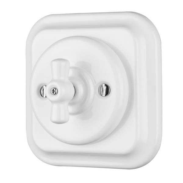 Interruptor conmutado fabricado en porcelana blanca con marco también de porcelana para instalación empotrada.