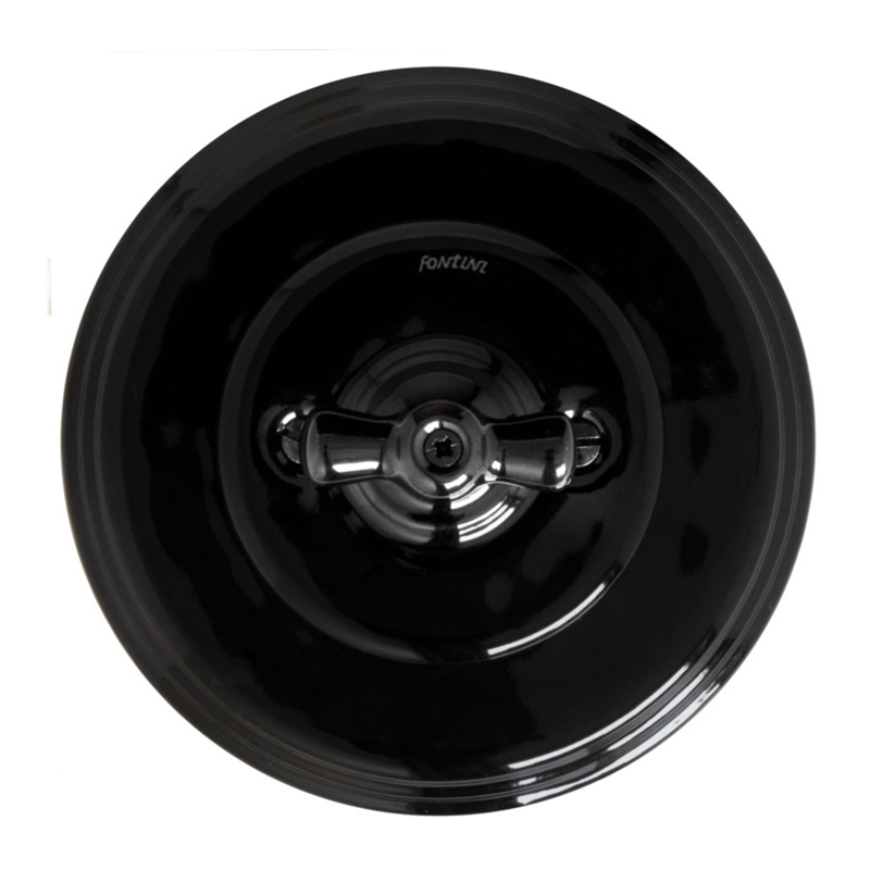 Interruptor conmutado fabricado en porcelana negra con marco también de porcelana para instalación empotrada.