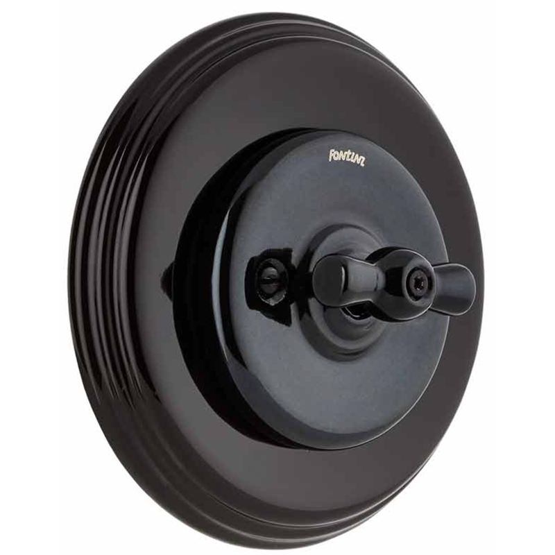 Interruptor conmutado fabricado en porcelana negra con marco también de porcelana para instalación empotrada.