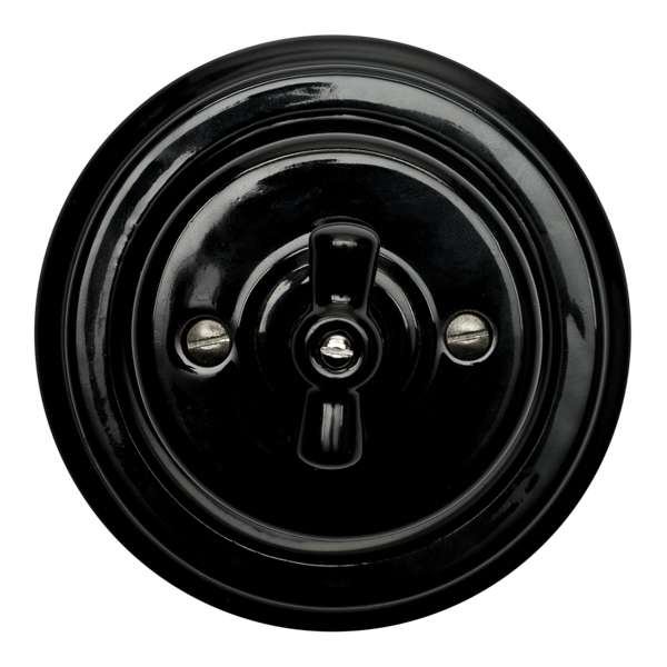 Interruptor conmutado fabricado en porcelana negra con marco también de porcelana para instalación empotrada.
