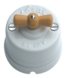 Interruptor conmutado de porcelana con mecanismo rotativo. Original diseño, replica del interruptor antiguo de las primeras instalaciones eléctricas. Evocan ambientes rústicos, dan un toque vintage a tu decoración. Mecanismo conmutado (permite el encendido combinado desde dos puntos). Fabricado en porcelana con lazo (maneta) de madera en acabado haya (clara).