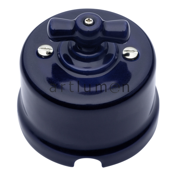 Interruptor con mecanismo rotativo. Fabricado en porcelana de color azul.