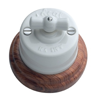 Interruptor conmutado de porcelana con mecanismo rotativo. Original diseño, replica del interruptor antiguo de las primeras instalaciones eléctricas. Evocan ambientes rústicos, dan un toque vintage a tu decoración. Mecanismo conmutado (permite el encendido combinado desde dos puntos). Fabricado en porcelana con base de madera en acabado bubinga (oscura).