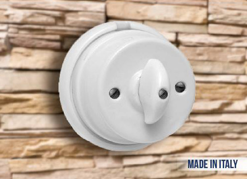 Interruptor de porcelana con mecanismo rotativo. Original diseño, replica del interruptor antiguo de las primeras instalaciones eléctricas. Con lazo (maneta) plana de porcelana.
