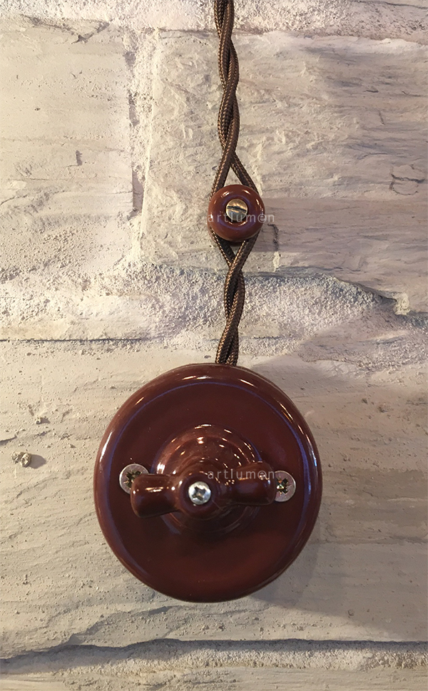 Interruptor de porcelana con mecanismo rotativo. Original diseño, replica del interruptor antiguo de las primeras instalaciones eléctricas. Ideal para entornos rústicos o para dar un toque vintage a tu decoración. Mecanismo conmutado (permite el encendido combinado desde dos puntos). Fabricado en porcelana de color marrón. Con lazo (maneta) de porcelana del mismo color. Instalación en superficie.