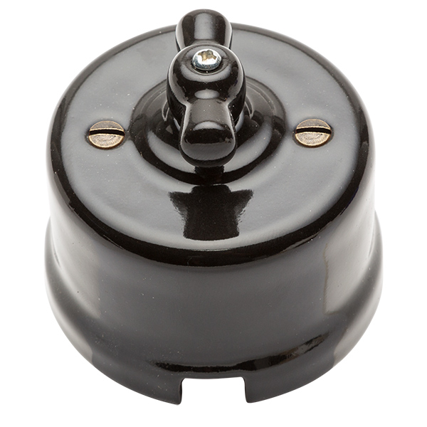 Interruptor de porcelana con mecanismo rotativo. Original diseño, replica del interruptor antiguo de las primeras instalaciones eléctricas. Ideal para entornos rústicos o para dar un toque vintage a tu decoración. Mecanismo conmutado (permite el encendido combinado desde dos puntos). Fabricado en porcelana de color negro. Con lazo (maneta) de porcelana del mismo color. Instalación en superficie. Consulte nuestro Blog: "Superficie o Empotrado" para más información.