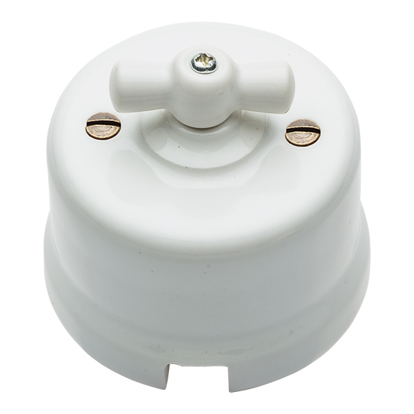 Interruptor conmutado de porcelana con mecanismo rotativo. Original diseño, replica del interruptor antiguo de las primeras instalaciones eléctricas. Ideal para entornos rústicos o para dar un toque vintage a tu decoración. Mecanismo conmutado (permite el encendido combinado desde dos puntos).