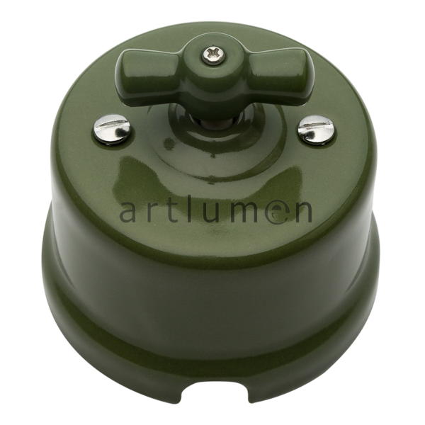Interruptor con mecanismo rotativo. Fabricado en porcelana de color verde. Original diseño, replica del interruptor antiguo de las primeras instalaciones eléctricas. Ideal para entornos rústicos o para dar un toque vintage a tu decoración.