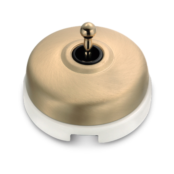 Interruptor dimbler (tipo tumbler) con base de porcelana blanca y embellecedor de metal acabado dorado satinado.