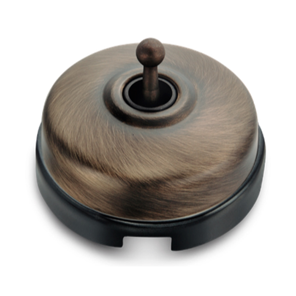 Interruptor dimbler (tipo tumbler) con base de porcelana negra y embellecedor de metal en acabado patiné satinado.