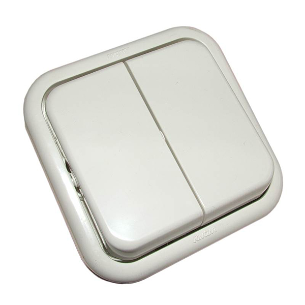 Interruptor conmutado doble para superficie, de color blanco.