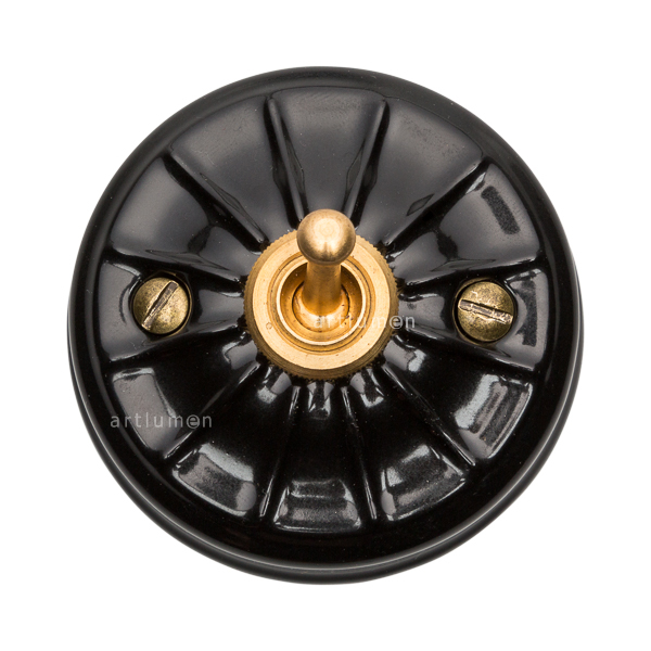 Interruptor con mecanismo conmutado de palanca, conocidos popularmente como “de rabillo”. Porcelana de alta calidad grabada con relieves vintage. El mecanismo queda elegantemente integrado en la porcelana, rematado con una arandela embellecedora metálica. La porcelana de color negro aporta una innovadora combinación de retro y vanguardismo. Combina a la perfección con nuestros enchufes de porcelana de esta misma serie.