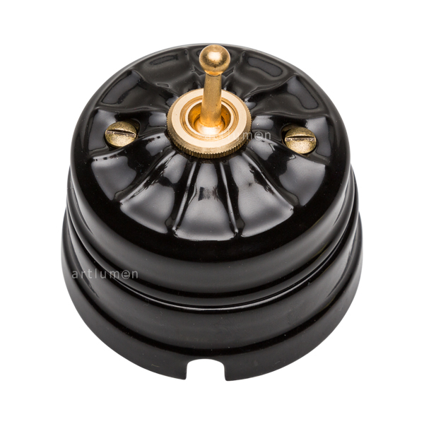 Interruptor con mecanismo conmutado de palanca, conocidos popularmente como “de rabillo”. Porcelana de alta calidad grabada con relieves vintage. El mecanismo queda elegantemente integrado en la porcelana, rematado con una arandela embellecedora metálica. La porcelana de color negro aporta una innovadora combinación de retro y vanguardismo. Combina a la perfección con nuestros enchufes de porcelana de esta misma serie.