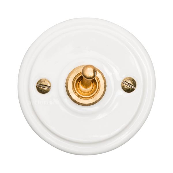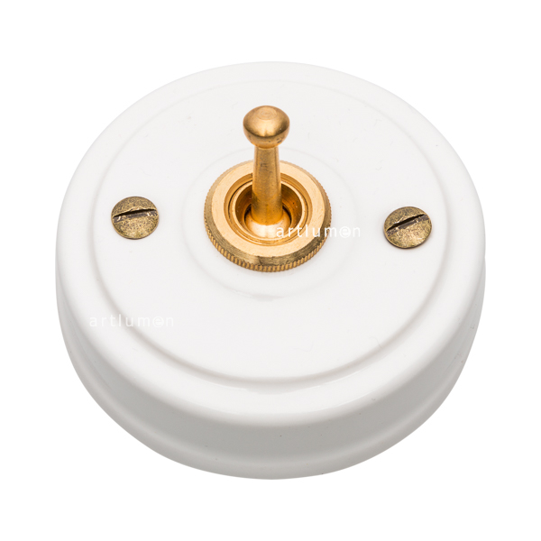 Interruptor con mecanismo conmutado de palanca, conocidos popularmente como “de rabillo”. El mecanismo queda elegantemente integrado en la porcelana, rematado con una arandela embellecedora metálica. Combina a la perfección con nuestros enchufes de porcelana de esta misma serie.