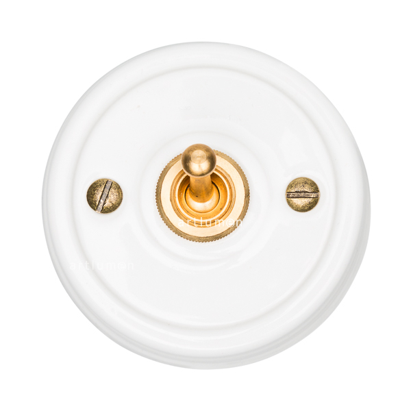 Interruptor con mecanismo conmutado de palanca, conocidos popularmente como “de rabillo”. El mecanismo queda elegantemente integrado en la porcelana, rematado con una arandela embellecedora metálica. Combina a la perfección con nuestros enchufes de porcelana de esta misma serie.