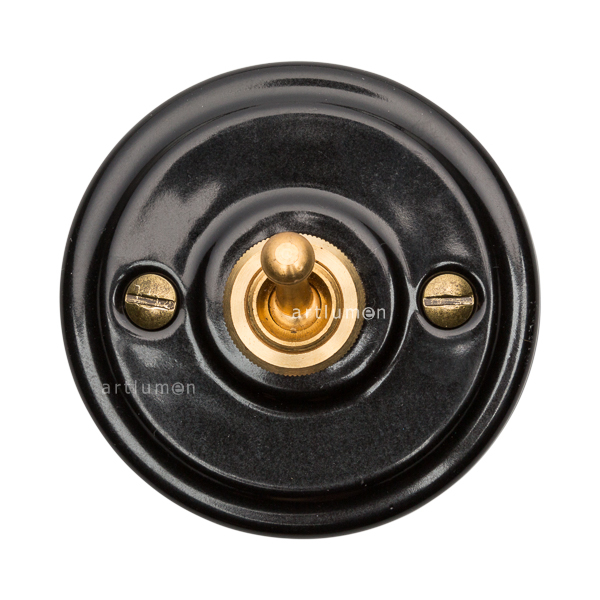 Interruptor con mecanismo conmutado de palanca, conocidos popularmente como “de rabillo”. La porcelana de color negro aporta una innovadora combinación de retro y vanguardismo.