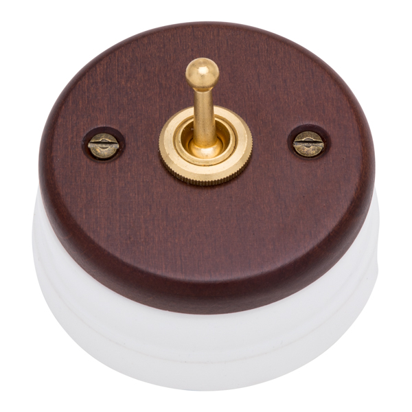 Interruptor latón, madera oscura y porcelana