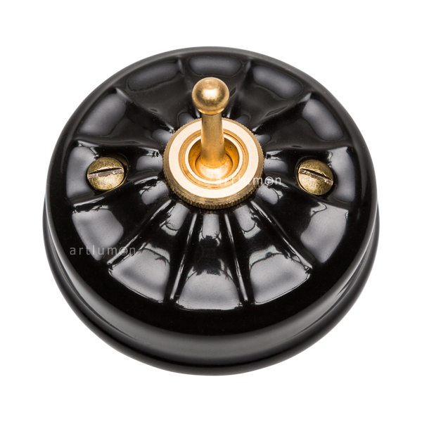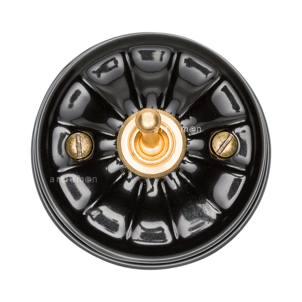 Interruptor con mecanismo conmutado de palanca, conocidos popularmente como “de rabillo”. Porcelana de alta calidad grabada con relieves vintage. El mecanismo queda elegantemente integrado en la porcelana, rematado con una arandela embellecedora metálica. La porcelana de color negro aporta una innovadora combinación de retro y vanguardismo. Combina a la perfección con nuestros enchufes de porcelana de esta misma serie.