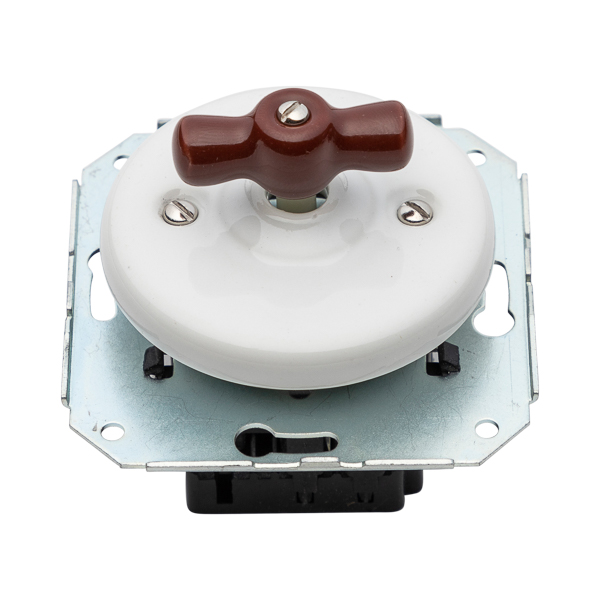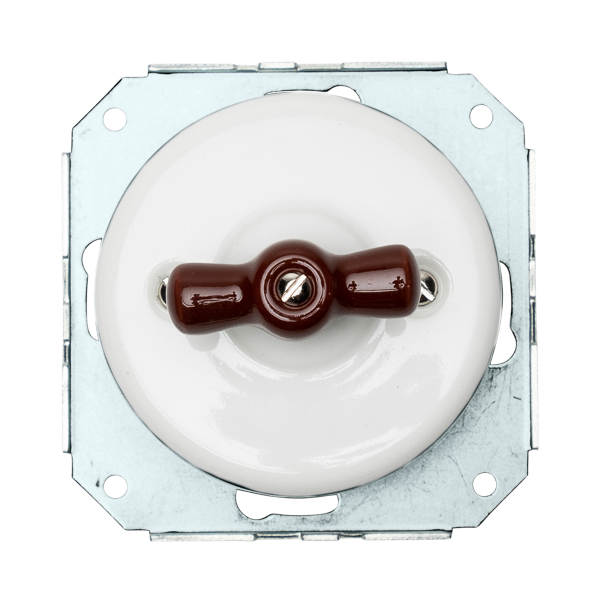 Interruptor conmutado fabricado en porcelana blanca con lazo de porcelana (maneta) de color marrón. Mecanismo para empotrar en cajetín universal (caja redonda o cuadrada). Llaves de luz que evocan otra época, un lujo para la vista y el tacto. Su mecanismo rotativo es conmutado (permite el encendido combinado desde dos puntos). 10A / 250V. Combinable con diferentes mecanismos en marcos de 1 a 3 elementos.