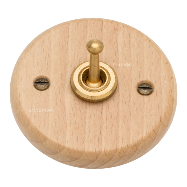 Interruptor tipo “rabillo”, fabricado en madera de haya barnizada en acabado natural. Robusto mecanismo de palanca fabricado en latón.