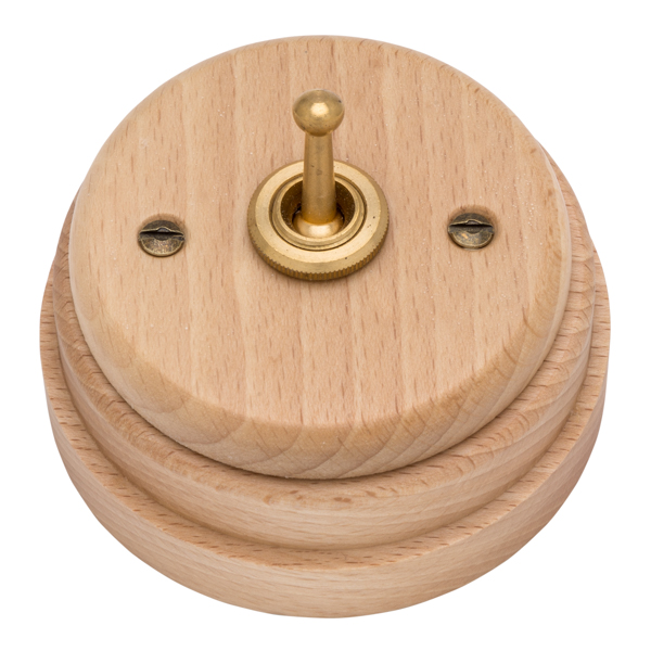 Interruptor tipo “rabillo”, fabricado en madera de haya barnizada en acabado natural. Robusto mecanismo de palanca fabricado en latón.
