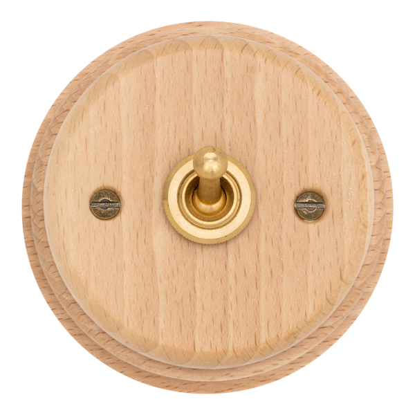 Interruptor tipo “rabillo”, fabricado en madera de haya barnizada en acabado natural. Robusto mecanismo de palanca fabricado en latón.