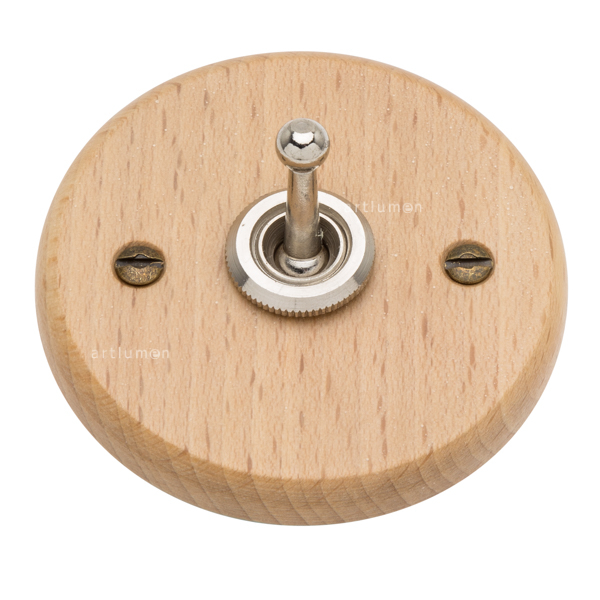Interruptor tipo “rabillo”, fabricado en madera de haya barnizada en acabado natural. Robusto mecanismo de palanca fabricado en níquel.