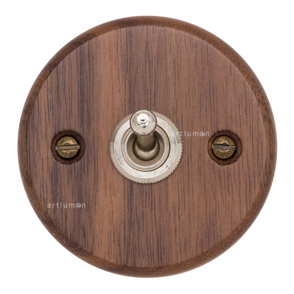 Interruptor tipo “rabillo”, fabricado en madera de nogal americano. Robusto mecanismo de palanca fabricado en níquel.