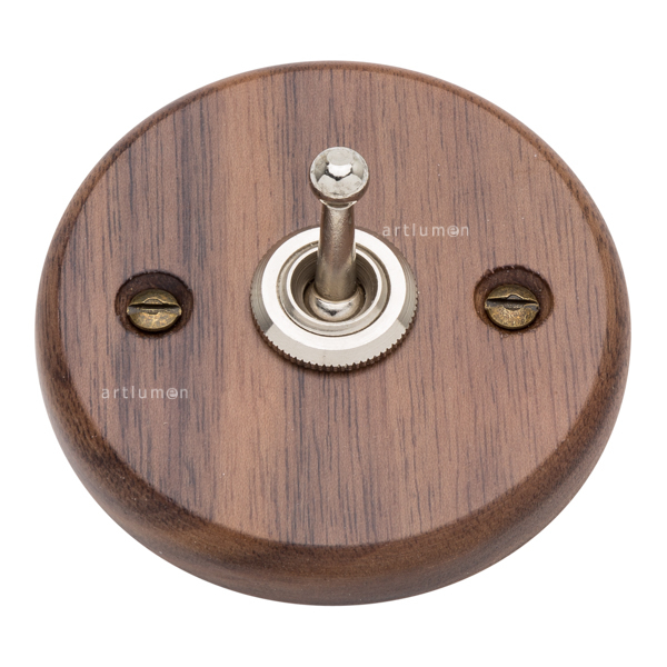 Interruptor tipo “rabillo”, fabricado en madera de nogal americano. Robusto mecanismo de palanca fabricado en níquel.