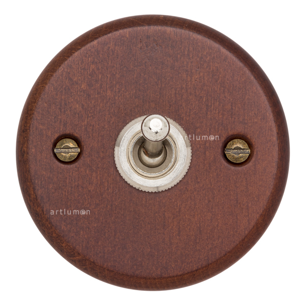 Interruptor tipo “rabillo”, fabricado en madera de haya barnizada en color castaño oscuro. Robusto mecanismo de palanca fabricado en níquel.