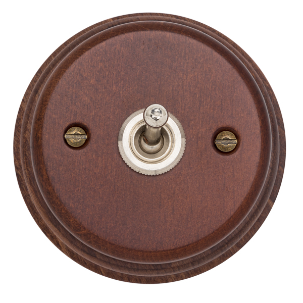 Interruptor tipo “rabillo”, fabricado en madera de haya barnizada en color castaño oscuro. Robusto mecanismo de palanca fabricado en níquel.