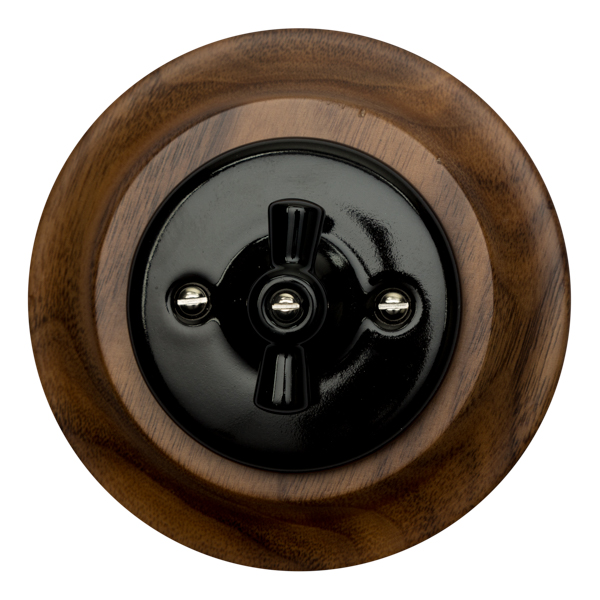 Interruptor conmutado fabricado en porcelana negra con marco de madera nogal americano para instalación empotrada.