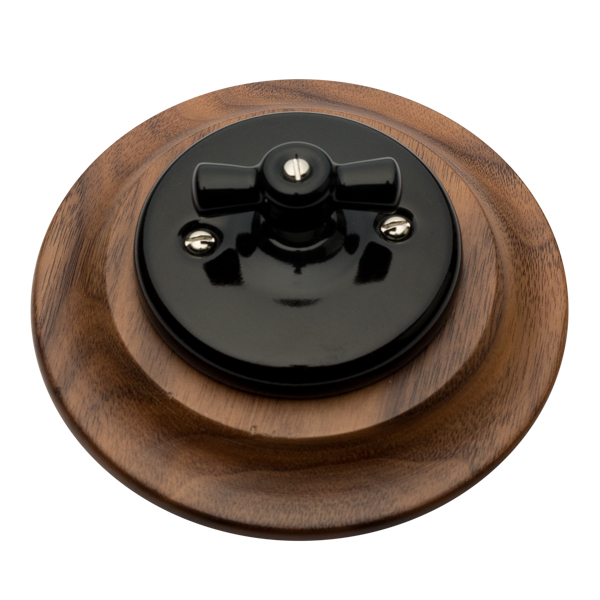 Interruptor conmutado fabricado en porcelana negra con marco de madera nogal americano para instalación empotrada.