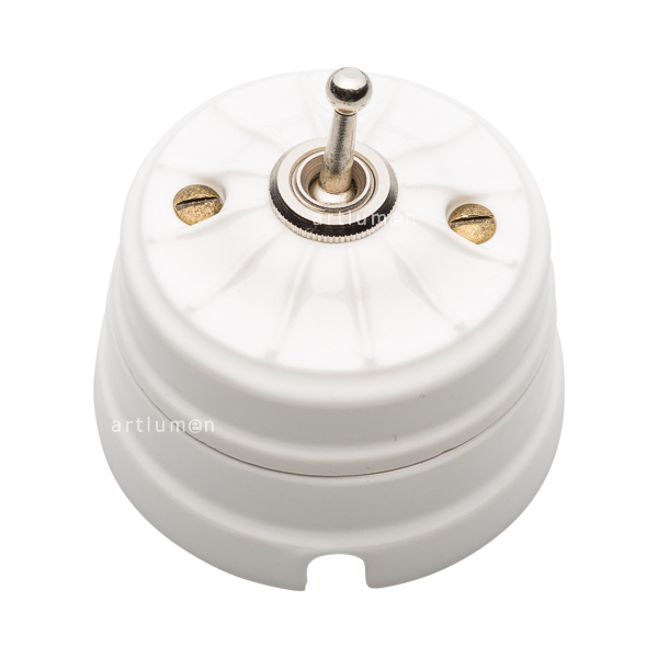 Interruptor con mecanismo conmutado de palanca, conocidos popularmente como “de rabillo”. Porcelana de alta calidad grabada con relieves vintage. El mecanismo queda elegantemente integrado en la porcelana, rematado con una arandela embellecedora metálica. Combina a la perfección con nuestros enchufes de porcelana de esta misma serie.