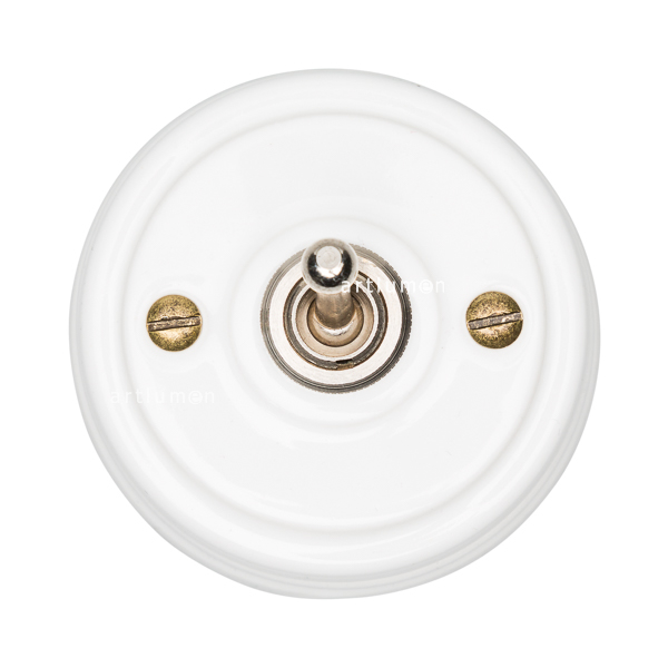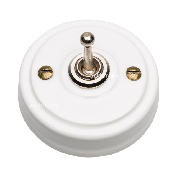 Interruptor con mecanismo conmutado de palanca, conocidos popularmente como “de rabillo”. El mecanismo queda elegantemente integrado en la porcelana, rematado con una arandela embellecedora metálica. Combina a la perfección con nuestros enchufes de porcelana de esta misma serie.