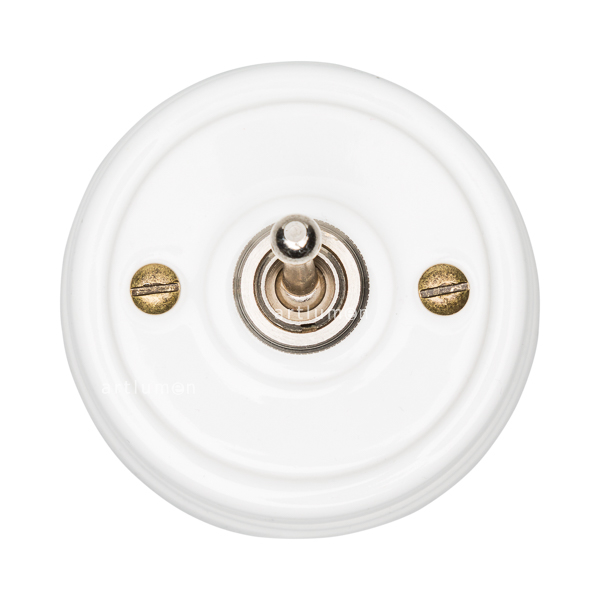 Interruptor con mecanismo conmutado de palanca, conocidos popularmente como “de rabillo”. El mecanismo queda elegantemente integrado en la porcelana, rematado con una arandela embellecedora metálica. Combina a la perfección con nuestros enchufes de porcelana de esta misma serie.
