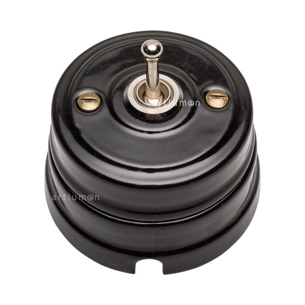 Interruptor con mecanismo conmutado de palanca, conocidos popularmente como “de rabillo”. La porcelana de color negro aporta una innovadora combinación de retro y vanguardismo.