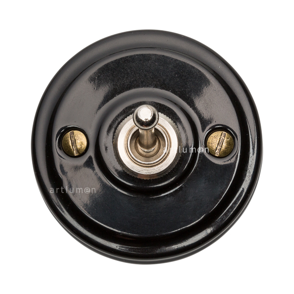 Interruptor con mecanismo conmutado de palanca, conocidos popularmente como “de rabillo”. La porcelana de color negro aporta una innovadora combinación de retro y vanguardismo.