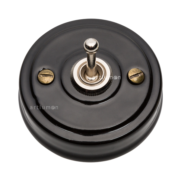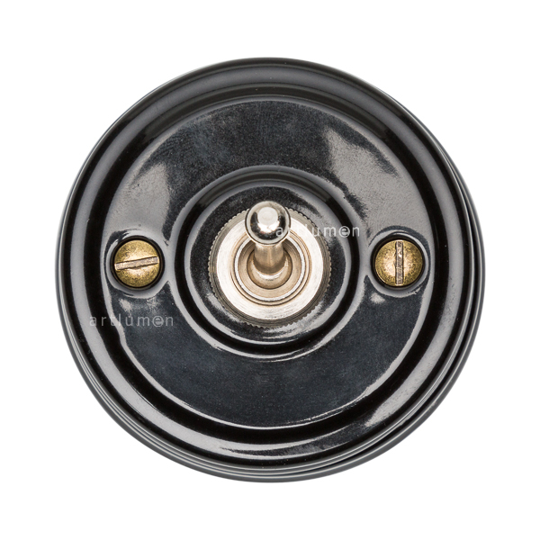 Interruptor con mecanismo conmutado de palanca, conocidos popularmente como “de rabillo”. La porcelana de color negro aporta una innovadora combinación de retro y vanguardismo.