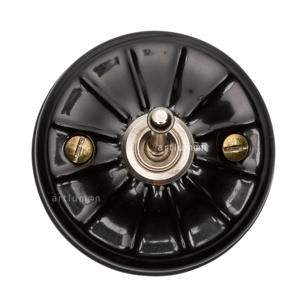 Interruptor con mecanismo conmutado de palanca, conocidos popularmente como “de rabillo”. Porcelana de alta calidad grabada con relieves vintage. El mecanismo queda elegantemente integrado en la porcelana, rematado con una arandela embellecedora metálica. La porcelana de color negro aporta una innovadora combinación de retro y vanguardismo. Combina a la perfección con nuestros enchufes de porcelana de esta misma serie.