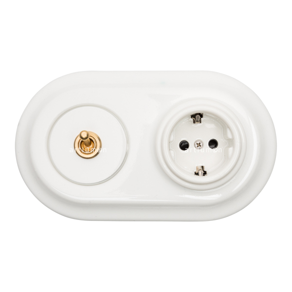 Conjunto formado por interruptor conmutado de palanca, fabricado en latón, y base de enchufe de porcelana. Ambos mecanismos agrupados en un marco doble de porcelana.