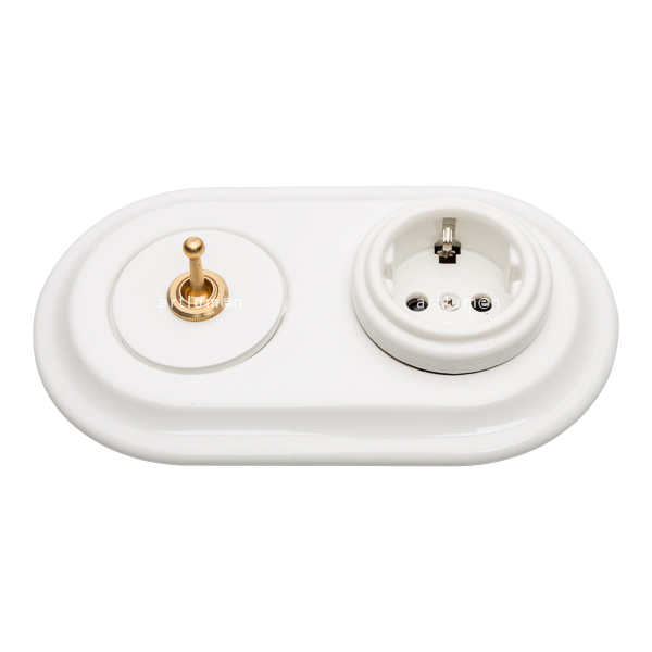Conjunto formado por interruptor conmutado de palanca, fabricado en latón, y base de enchufe de porcelana. Ambos mecanismos agrupados en un marco doble de porcelana.