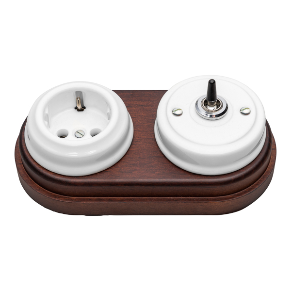 Conjunto de un interruptor de porcelana con mecanismo de palanca, conocidos popularmente como “de rabillo” y un enchufe de porcelana sobre madera doble. La palanca, de color negro, queda elegantemente integrada en la porcelana, rematada con una arandela embellecedora metálica. En esta composición resalta la madera que abraza todo el conjunto. Grupo de mecanismos muy habituales de los dormitorios. Conmutado y enchufe agrupado por una madera natural que le aporta al conjunto gran personalidad y fuerza.