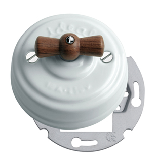 Interruptor de porcelana con mecanismo rotativo. Original diseño, replica del interruptor antiguo de las primeras instalaciones eléctricas. Ideal para entornos rústicos o para dar un toque vintage a tu decoración. Mecanismo conmutado (permite el encendido combinado desde dos puntos). Fabricado en porcelana. Con lazo (maneta) de madera acabado bubinga.