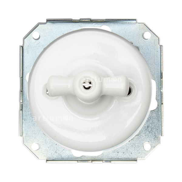 Interruptor conmutado fabricado en porcelana blanca para empotrar en cajetín universal (caja redonda o cuadrada). Llaves de luz que evocan otra época, un lujo para la vista y el tacto. Su mecanismo rotativo es conmutado (permite el encendido combinado desde dos puntos).